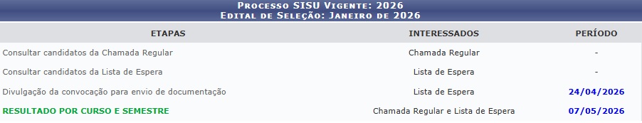 - Passo: Conferir, na data prevista pelo Edital o Resultado Parcial, por meio do menu Resultado por Curso e Semestre na página de acompanhamento.